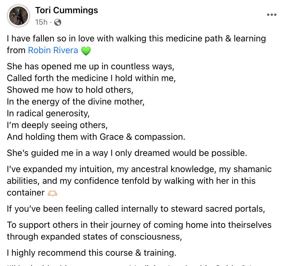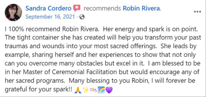 "Working with Robin was like a dynamite of expansion! Going from feeling un-confident in my sales to having my first $100k PLUS launch & selling out my program, all within 3 weeks... working with Robin was invaluable! Her real world experience, shamanic gifts & expertise in business were exactly what I needed to take me over the line. Robin's work produces results, & I'm so excited to work with her again..."